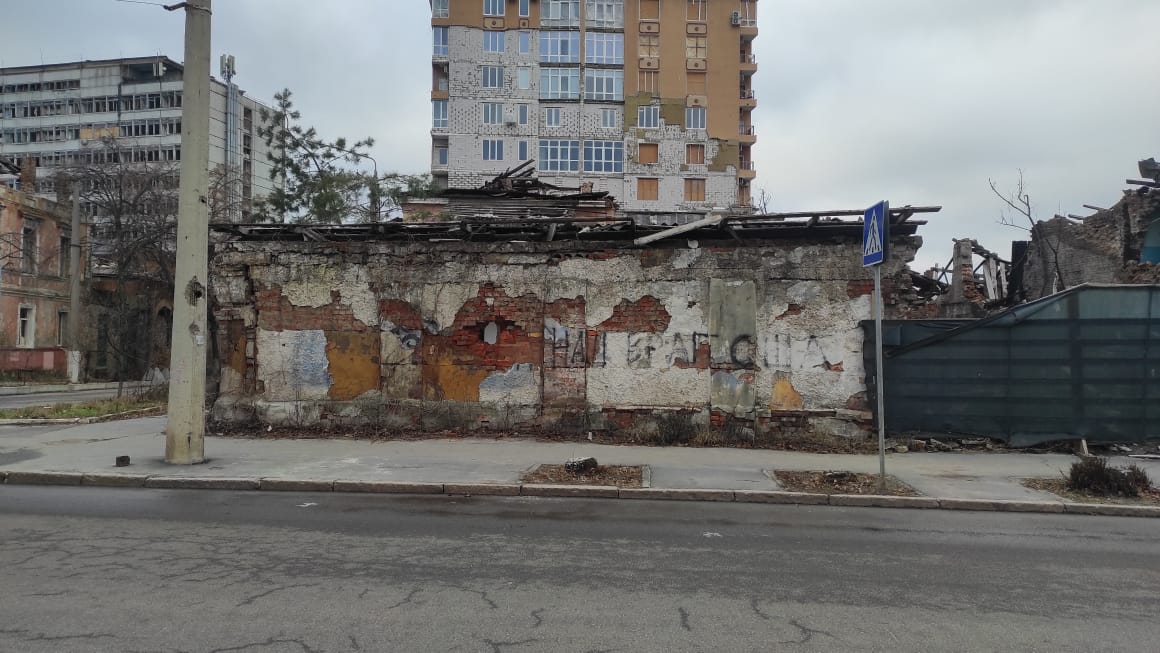 The collaborators' inscription "Our enemy is the USA" at the site of the airstrike.