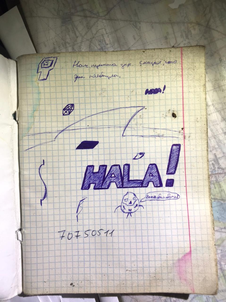 A notebook with pictures by the Russian military and the inscriptions "HALA! [unintelligible]", found in the premises occupied by the headquarters of the Russian military.